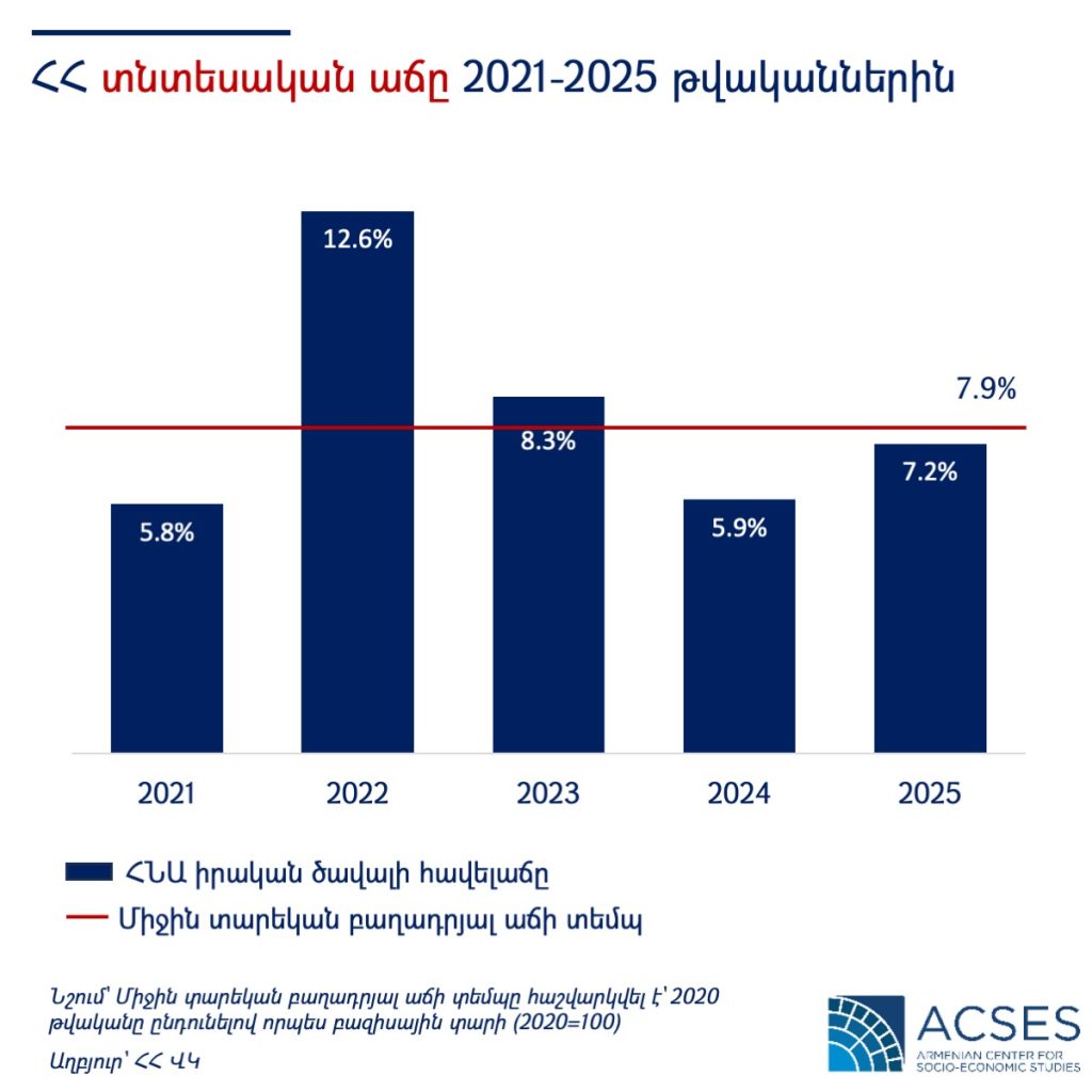 2025 թվականին Հայաստանի ՀՆԱ-ի իրական ծավալի հավելաճը, ըստ նախնական տվյալների, կազմել է 7.2%, ինչը 1.3%-ային կետով բարձր է 2024 թվականի ցուցանիշից (5.9%)։