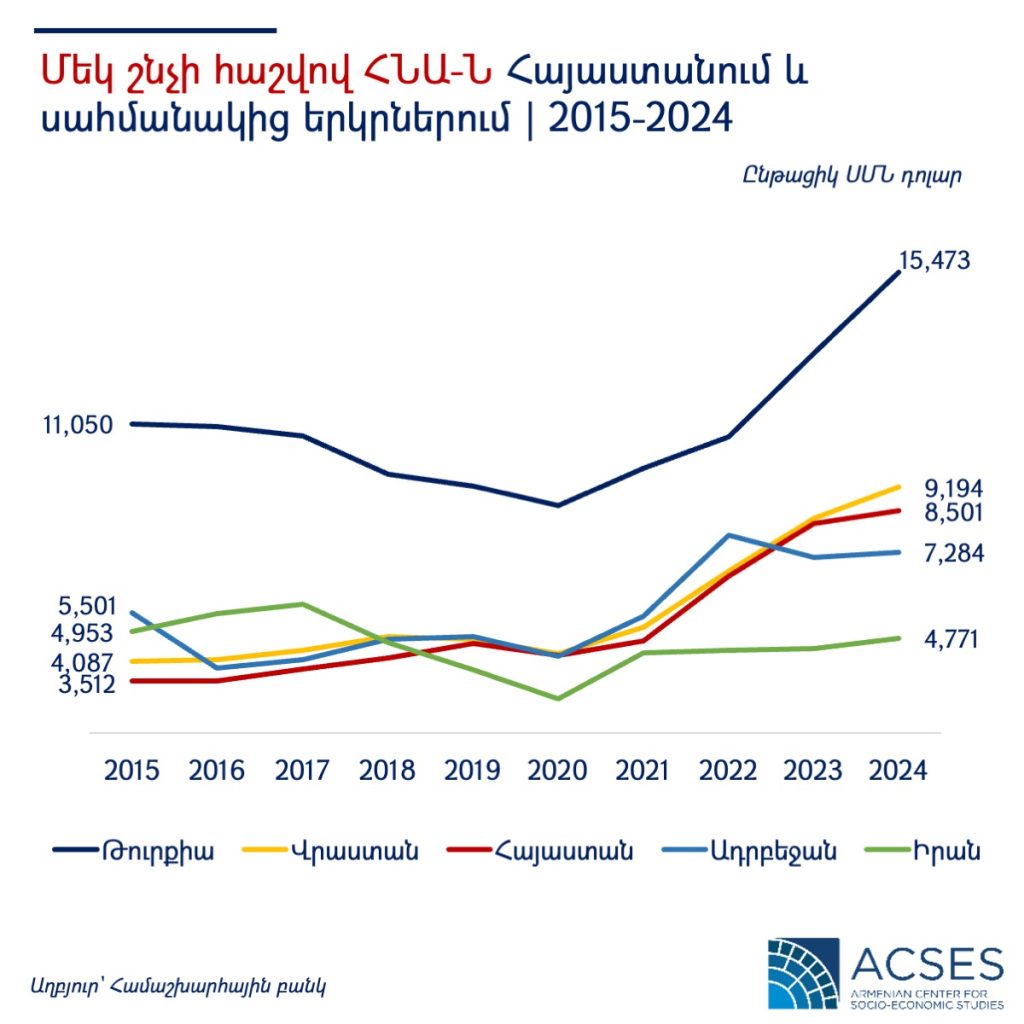 - 2024 թվականին Հայաստանը դիտարկված երկրների շրջանում երրորդն է (8,501 ԱՄՆ դոլարով)` զիջելով Թուրքիային և Վրաստանին։ Պետք է նշել, որ վերջին տարիներին՝ դոլարի նկատմամբ դրամի արժևորմամբ պայմանավորված, դոլարով արտահայտված մեկ շնչի հաշվով ՀՆԱ-ի աճը Հայաստանում ավելի բարձր էր, քան դրամով արտահայտված ցուցանիշի աճը։ Օրինակ՝ 2022 թվականին դոլարով արտահայտված 1 շնչի հաշվով ՀՆԱ-ն Հայաստանում աճել է 40%-ով, այնինչ դրամով արտահայտված ցուցանիշը՝ 21%-ով, նույն պատկերը դիտվում է նաև 2023-ին (համապատասխանաբար 24% և 11%):